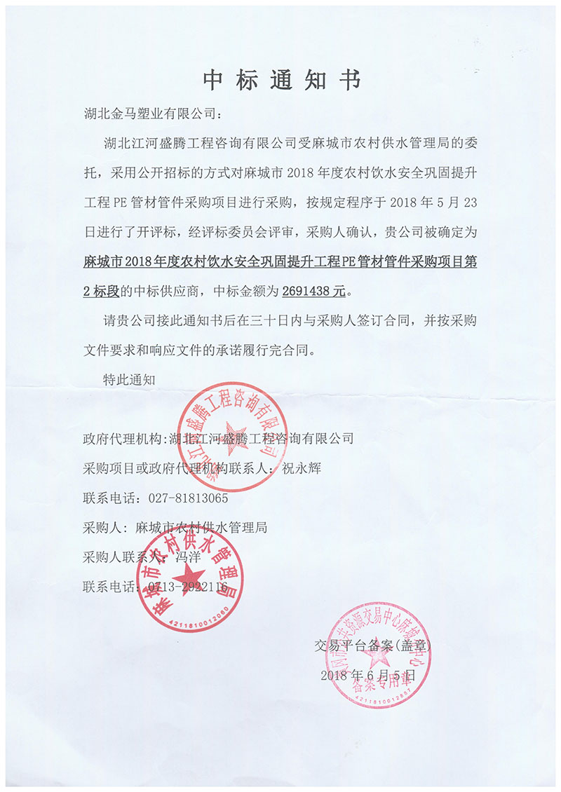 公司新聞 網(wǎng)站首頁 > 公司新聞 麻城市2018年度農(nóng)村飲水安全鞏固提升工程PE管材管件采購項(xiàng)目 2021-03-24 閱讀 74572 上一篇: 祝賀金馬塑業(yè)中標(biāo)湘陰縣2018年農(nóng)村飲水安全環(huán)保督察項(xiàng)目 下一篇: 祝賀金馬塑業(yè)中標(biāo)崇陽縣2018年度農(nóng)村飲水安全鞏固提升工程