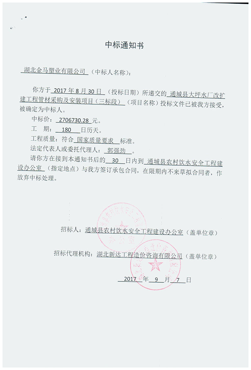 公司新聞 網(wǎng)站首頁(yè) > 公司新聞 祝賀金馬塑業(yè)中標(biāo)通城縣大坪水廠(chǎng)改擴(kuò)建工程管材采購(gòu)及安裝項(xiàng)目 2021-03-24 閱讀 123831 上一篇: 祝賀金馬塑業(yè)中標(biāo)東蘭縣三石鎮(zhèn)富硒米示范基地高效節(jié)水灌溉工程 下一篇: 黃州區(qū)農(nóng)村飲水安全工程鞏固提升工程項(xiàng)目
